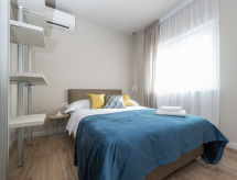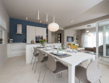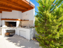 Villa 5 pièces 170 m2 sur 2 niveaux, situation nord-ouest. Séjour/salle à manger 60 m2 avec TV (satellite) (écran plat), air-conditionné. Sortie sur la terrasse. 1 chambre avec 1 grand-lit (160 cm, longueur 200 cm), douche/WC et air-conditionné. Cuisine ouverte (four, lave-vaisselle, 4 plaques vitrocéramiques, four micro-ondes, congélateur, cafetière électrique). WC séparé. À l'étage supérieur: entrée. Sortie sur la terrasse. 1 chambre avec 1 grand-lit (160 cm, longueur 200 cm), douche/WC et TV (satellite) (écran plat), air-conditionné. Sortie sur la terrasse. 2 chambres, chaque chambre avec: 1 grand-lit (160 cm, longueur 200 cm), air-conditionné. Douche/WC. Chauffage par le sol. Terrasse 15 m2, couverte, 2 terrasses 8 m2. Meubles de terrasse, chaises longues. Vue éloignée sur la mer. A disposition: sèche-cheveux. Internet (Connexion WIFI, gratuit).- Installations