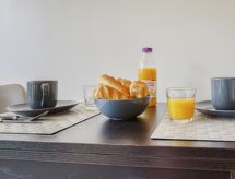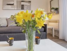 Studio 20 m2, rez-de-chaussée surélevé. Aménagement confortable et moderne: petite entrée. Séjour/salle à manger avec 1 divan-lit double (1 x 140 cm, longueur 190 cm), TV. Sortie sur le balcon. Coin cuisine (2 plaques vitrocéramiques, grille-pain, bouilloire électrique, four micro-ondes, cafetière électrique). Petit balcon. Mobilier de balcon. A disposition: lave-linge. Internet (Connexion WIFI, en sus). Veuillez noter: logement non-fumeur. Détecteur de fumée.- Caractéristiques de l'hébergement