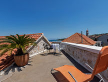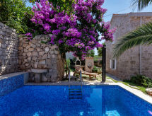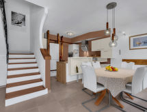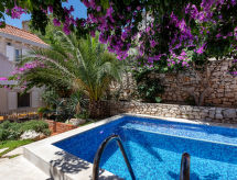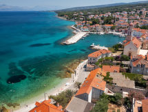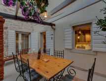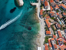 Maison individuelle "Marijan", de 2 étages. Situation ensoleillée, excellente situation: centrale mais tranquille, au cœur de la ville, à 50 m de la mer, à 50 m de la plage. A usage privé: terrain 120 m2 (clôturé), jardin sur plusieurs niveaux entretenu, piscine rectangulaire, chauffée (4 x 3 m, 14 m2, profondeur 150 cm, disponibilité saisonnière: 10.Avr. - 10.Oct.) avec systeme d'électolyseur au sel. Douche extérieure, barbecue. Infrastructures de la Maison: accès internet, terrasse sur le toit, lave-linge. Place de parking (pour 2 voitures) près de la maison sur le terrain. Magasins, restaurant 400 m, plage de graviers 50 m. Piscine avec hydromassage. Parking pour 2 petites voitures.Interior