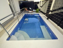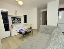 "Marin", apt 3 pièces 58 m2, au rez-de-chaussée, situation sud. Aménagement agréable et moderne: séjour/salle à manger avec TV (câblée) (écran plat), air-conditionné. Sortie sur la terrasse, sur la piscine. 2 chambres, chaque chambre avec: 1 grand-lit (160 cm, longueur 200 cm). Cuisine ouverte (four, lave-vaisselle, 4 plaques vitrocéramiques, congélateur, cafetière électrique). Douche/WC. Terrasse 10 m2. Chaises longues (2). Vue sur la piscine. A disposition: sèche-cheveux. Internet (Connexion WIFI, gratuit). Place de parking (1 Voiture). Veuillez noter: logement non-fumeur.- Installations