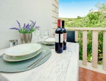 Razanj à 10 km de Rogoznica: Belle petite résidence "Marina". Dans le quartier de Ljoljinica, situation tranquille, surélevée, à 40 m de la mer. En commun: douche extérieure, terrasse, meubles de jardin, barbecue, place de parking près de la maison sur le terrain, garage en commun. Magasins, restaurant 200 m, plage de rochers 40 m. Veuillez noter: D’autres appartements sont également proposés à la location dans cette maison de vacances.Interior