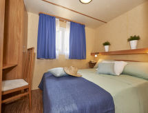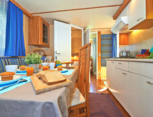 "Maxi Caravan Escale", 3 pièces mobil home 22 m2. Aménagement fonctionnel: 1 chambre avec 1 grand-lit (140 cm). 1 chambre avec 2 lits (70 cm). Cuisine/séjour (4 feux) avec 1 divan-lit, coin repas et air-conditionné. Sortie sur la terrasse. Douche/WC. Pas de chauffage. Terrasse, tonnelle. Meubles de terrasse. A disposition: chaise haute pour enfant, lit bébé. Internet (Connexion WIFI, en sus). Place de parking. Veuillez noter: logement non-fumeur.- Installations