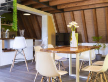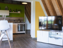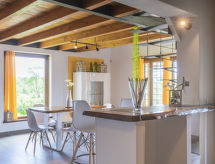 Chalet 2 pièces 60 m2 sur 2 niveaux, rez-de-chaussée surélevé. Aménagement moderne et de style: séjour/salle à manger ouvert avec 1 divan-lit double et TV (écran plat). Sortie sur la terrasse. Cuisine ouverte (four, lave-vaisselle, 4 feux, grille-pain, congélateur, cafetière électrique). Sortie sur la terrasse. WC séparé. Chauffage électrique, air-conditionné. À l'étage supérieur: galerie mansardée, ouverte avec 1 lit double (140 cm). Douche/bidet/WC. Terrasse 45 m2. Meubles de terrasse. Belle, sur les alentours. A disposition: Internet (Connexion WIFI).- Installations
