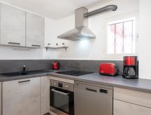 "Mimosas", apt 2 pièces 46 m2, au rez-de-chaussée. Aménagement fonctionnel et agréable: séjour/salle à manger avec TV (écran plat). Sortie sur la terrasse. Alcôve avec 1 grand-lit (1 x 140 cm, longueur 190 cm). 1 chambre avec 1 grand-lit (1 x 160 cm, longueur 200 cm). Cuisine ouverte (four, lave-vaisselle, 4 plaques à induction, grille-pain, bouilloire électrique, four micro-ondes, cafetière électrique). Douche/WC. Chauffage électrique. Terrasse 18 m2. Meubles de terrasse, barbecue électrique. A disposition: lave-linge, fer à repasser, sèche-cheveux. Internet (Connexion WIFI, gratuit). Place de parking. Veuillez noter: 1 animal/ chien de petite taille autorisé. Détecteur de fumée. 645450001900B- Installations