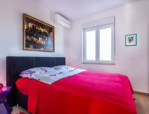 "Mirela (MDN157)", maison jumelée 4 pièces 120 m2 sur 2 niveaux. Aménagement moderne et de style: séjour/salle à manger avec TV (satellite) (écran plat), air-conditionné. Sortie sur la terrasse. Cuisine ouverte (four, lave-vaisselle, 4 plaques vitrocéramiques, grille-pain, bouilloire électrique, four micro-ondes, congélateur, cafetière électrique). Douche/WC. À l'étage supérieur: 2 chambres, chaque chambre avec: 1 lit, 1 lit double et air-conditionné. Sortie sur le balcon. 1 chambre avec 1 lit double et air-conditionné. Douche/WC. Chauffage à air chaud. Balcon, terrasse. Meubles de terrasse, mobilier de balcon, barbecue (portable), chaises longues. A disposition: lave-linge, lit bébé. Internet (Connexion WIFI, gratuit). Veuillez noter: maison non-fumeur.- Installations