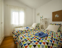 Belle, grande maison jumelée confortable "Mirlo", de 2 étages. Dans la localité, à 3 km du centre, situation tranquille, ensoleillée, à 500 m de la mer, à 500 m de la plage. A usage privé: beau jardin entretenu avec pelouse et arbres, piscine rectangulaire (5 x 4 m, profondeur 80 - 180 cm, disponibilité saisonnière: 01.Jan. - 31.Dec.) avec marches intérieures. Douche extérieure, meubles de jardin, place de parking sur le terrain. Supermarché 2 km, restaurant 450 m, bar, café 500 m, plage de sable "Plaza de Les Marines" 500 m. Port plaisance 3 km, ecole de surf 1 km, tennis 2 km. Le propriétaire n'accepte pas les groupes de jeunes.Interior