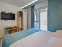 Apt 4 pièces 90 m2, rez-de-chaussée surélevé, situation nord-ouest. Séjour/salle à manger 24 m2 avec TV (satellite) (écran plat), air-conditionné. 3 chambres, chaque chambre avec: 1 grand-lit (160 cm, longueur 200 cm), douche/WC et TV (satellite) (écran plat), air-conditionné. Sortie sur la terrasse. Cuisine ouverte (four, lave-vaisselle, 4 plaques vitrocéramiques, four micro-ondes, congélateur, cafetière électrique). Balnéo. Air-conditionné (en sus). Terrasse 90 m2. Meubles de terrasse. Vue sur la mer. A disposition: lave-linge. Internet (Connexion WIFI, gratuit). Privé: bain à remous situé sur un terrasse de 90 m².- Installations