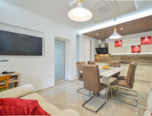 Arbanija (Čiovo) à 4 km de Trogir: Immeuble "Mornar". À 550 m du centre d'Arbanija, situation ensoleillée, à 20 m de la mer, à 20 m de la plage, route à traverser, dans une rue. En commun: terrain 466 m2, piscine rectangulaire chauffée (7 x 3 m, 24 m2, profondeur 126 - 176 cm, disponibilité saisonnière: 01.Avr. - 15.Oct.) avec marches intérieures. Terrasse (30 m2), barbecue. Infrastructures de la Maison: accès internet. A disposition: bateau (en sus). Parking public possible dans la rue. Magasins, restaurant 550 m, plage de graviers, plage de rochers, plage bétonnée 20 m. Veuillez noter: place d'amarrage privée (en sus) sur demande. Le bateau à moteur du propriétaire peut être loué (sur demande, en sus). À noter : permis requis.Interior