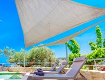 "Murtal", villa 4 pièces. Aménagement confortable et moderne: grand séjour/salle à manger avec 2 divans-lits, TV (satellite), lecteur CD et air-conditionné. Sortie sur la piscine. 1 chambre double avec 1 lit double et air-conditionné. Sortie sur la terrasse. Grande cuisine (four, 2 plaques vitrocéramiques). Sortie sur le jardin. WC séparé. À l'étage supérieur: 2 chambres doubles, chaque chambre avec: 1 lit double, douche/WC et air-conditionné. Sortie sur le balcon. Sol en bois. Barbecue. Superbe vue panoramique sur la mer, la piscine et les alentours. A disposition: lave-linge, sèche-linge, fer à repasser, chaise haute pour enfant, lit bébé. Adapté(e) aux familles. 1067411- Installations