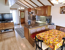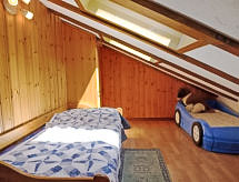 Apt 4 pièces 85 m2, sous le toit. Aménagement confortable et plaisant: séjour/salle à manger avec TV (satellite) (écran plat), radio et chaîne stéréo. 1 chambre double mansardée avec 1 lit double. Sortie sur le balcon, orientée nord. 1 chambre mansardée avec 2 lits. 1 chambre mansardée avec 1 lit. Cuisine ouverte (four, lave-vaisselle, 4 plaques vitrocéramiques) avec table pour les repas. Bain/WC. Chauffage électrique, chauffe eau (250 litres). Jardinet. Meubles de terrasse. Belle vue sur les montagnes, les alentours et la localité. 1 animal/ chien autorisé.- Installations