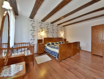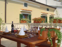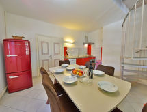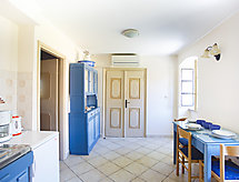 Apt 8 pièces 158 m2 sur 2 niveaux au 1er étage, situation sud. Aménagement rustique et de bon goût: séjour 23 m2 avec TV (satellite) (écran plat), DVD. Sortie sur la terrasse. Séjour/salle à manger avec coin-cuisine et air-conditionné. 1 chambre avec 1 lit double (2 x 90 cm, longueur 200 cm), TV (satellite) (écran plat). Séjour/salle à manger avec coin-cuisine et TV (satellite) (écran plat). 1 chambre avec 1 grand-lit (1 x 190 cm, longueur 200 cm), TV (satellite) (écran plat). Salle à manger 15 m2. 1 chambre avec 1 lit (80 cm, longueur 190 cm), 1 lit double (2 x 90 cm, longueur 200 cm), TV (satellite) (écran plat), air-conditionné. Cuisine ouverte (4 plaques de cuisson, four, lave-vaisselle, congélateur). Douche/WC, 3 douches/bidet/WC. Sous le toit: (escalier en colimaçon) 1 chambre, hauteur plafond 70 - 230 cm avec 1 grand-lit (1 x 180 cm, longueur 190 cm), douche/WC et TV (satellite) (écran plat), air-conditionné. Terrasse 26 m2, situation sud. Meubles de terrasse. Superbe vue panoramique sur la mer et les alentours. A disposition: lave-linge. Internet (Connexion WIFI, gratuit). Il s'agit de 3 appartements séparés par un salon et une terrasse communs. Chaque appartement a son propre coin cuisine.- Installations