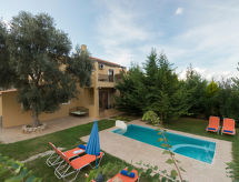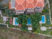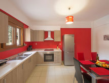 "Pathos", villa 4 pièces 113 m2 sur 2 niveaux. Aménagement très confortable et agréable: séjour ouvert avec TV (satellite) (écran plat), radio, lecteur CD et DVD. Sortie sur le jardin, sur la piscine. Cuisine ouverte (four, lave-vaisselle, 4 plaques vitrocéramiques, four micro-ondes, cafetière électrique) avec table pour les repas. WC séparé. Air-conditionné. À l'étage supérieur: (escalier sans rampe) 1 chambre double avec 2 lits. Sortie sur le balcon. 2 chambres doubles, chaque chambre avec: 1 lit double. Sortie sur le balcon. Bain/WC. Air-conditionné. Grand balcon. Très belle vue panoramique sur les montagnes et les alentours. A disposition: lave-linge, coffre-fort, fer à repasser, sèche-cheveux. Internet (Connexion WIFI, gratuit). 1041K91002952601- Installations