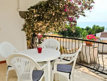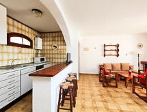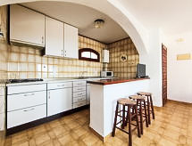 Maison mitoyenne 2 pièces 56 m2, sous-sol de plain-pied. Aménagement fonctionnel et plaisant: séjour/salle à manger avec 1 lit rabattable (140 cm, longueur 190 cm), TV (satellite). 1 chambre avec 1 lit double. Cuisine ouverte (lave-vaisselle, combiné micro-ondes). Douche/WC. Air-conditionné, chauffage à air chaud. Terrasse 50 m2. Meubles de terrasse, chaises longues (2). Vue sur la mer, les alentours et la localité. A disposition: lave-linge. AT-28286-CS- Installations