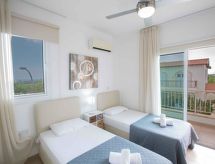 Maison individuelle, 4 pièces pour 6 personnes, 110 m2 sur 2 niveaux, moderne et luxueux aménagement. Séjour/salle à manger avec TV régional, TV (satellite) et table pour les repas. Non permis de fumer. Internet (Connexion WIFI). Chambre à coucher avec 1 lit double. Chambre à coucher avec 2 lits doubles. Chambre à coucher avec 2 lits doubles. Cuisine/séjour avec four à 4 plaques, four micro-ondes, four, table pour les repas, lave-vaisselle et réfrigérateur. Salle de bains, douche/WC et WC séparés. Autres fournitures: coffre-fort, chaise haute pour enfant, sèche-cheveux, fer à repasser, lave-linge, sèche-linge. This beautifully kept 3 bedroom villa is spacious both inside and outside and furnished to a very high standard. Located in the Pernera area of Protaras, it is within 10 minutes walk of both Kalamies Beach and the resort centre.Inside, the villa has a very modern yet comfortable design. The living area has leather sofas, a widescreen TV with a Full UK satellite and dining table seating 6 persons. The large open plan kitchen is fully equipped with modern appliances. There is also a W/C on this floor.Upstairs, the master bedroom features a double bed and en-suite shower room. There is also access to a veranda. There are another 2 bedrooms, both with single beds .Outside the private garden has a 6 x 3 metre pool from where you can also enjoy the sea views. Sun-loungers and an umbrella are provided, along with a patio table and chairs. A built-in BBQ and sink area provide the perfect setting for outside dining and entertaining during the long summer evenings.Satellite TV and free WIFI are available and the villa has full air-conditioning.Overall this is a great villa option for families and groups of friends, looking for a luxury property within easy reach of the beach and resort centre. Bedroom 1: 1 Double Bed with en-suite bathroom / Bedroom 2: 2 Single Beds / Bedroom 3: 2 Single Beds.- Caractéristiques de l'hébergement