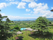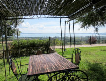 "Pomele", apt 3 pièces 62 à 74 m2, au rez-de-chaussée. Aménagement rustique: séjour/salle à manger avec cheminée (uniquement à titre de décoration), table pour les repas et TV (satellite). 1 chambre avec 1 lit double et douche/WC. 1 chambre avec 2 lits. Sortie sur la terrasse. Coin cuisine (four, 4 feux, grille-pain, bouilloire électrique, congélateur). Douche/WC. Chauffage au gaz (en sus), air-conditionné (en sus). Terrasse couverte, jardinet. Meubles de terrasse. Vue sur le lac. A disposition: chaise haute pour enfant, lit bébé. Internet (Connexion WIFI, gratuit). Veuillez noter: maison non-fumeur.- Installations
