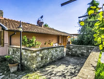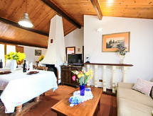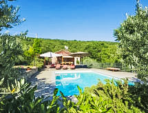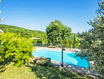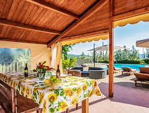 Maison 4 pièces 100 m2 sur 2 niveaux. Aménagement confortable et avec beaucoup de bois: entrée. 1 chambre double. Cuisine (4 plaques de cuisson, lave-vaisselle, four micro-ondes, congélateur) avec table pour les repas, cheminée. Douche/bidet/WC, douche à jets. À l'étage supérieur: grand séjour/salle à manger avec cheminée, TV (satellite) et écran plat. Sortie sur la terrasse, sur le jardinet, sur la piscine. 1 chambre double. 1 chambre avec 1 lit et 1 lit double. Douche/bidet/WC. Chauffage au gaz. Terrasse 150 m2, grand jardinet 30 m2, partiellement couvert. Meubles de terrasse, barbecue, chaises longues. Très belle vue panoramique sur les alentours. A disposition: lave-linge, moustiquaire, lit bébé jusqu'à 2 ans, sèche-cheveux. Internet (Connexion WIFI, gratuit). Place de parking. 1 animal/ chien autorisé.- Installations