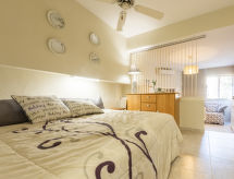 "Promar", apt 2 pièces 30 m2. Logement idéal pour 3 adultes. Aménagement fonctionnel: séjour/salle à manger avec 1 divan-lit (90 cm, longueur 180 cm), Télévision numérique et air-conditionné. 1 chambre avec 2 lits (90 cm, longueur 180 cm). Cuisine/séjour (four, 3 plaques vitrocéramiques, grille-pain, bouilloire électrique, four micro-ondes, cafetière électrique). Douche/WC. Pas de chauffage. A disposition: lave-linge, fer à repasser, chaise haute pour enfant, lit bébé jusqu'à 3 ans, sèche-cheveux. Internet (Connexion WIFI). Veuillez noter: adapté(e) aux familles. Logement non-fumeur. R000000001- Installations