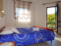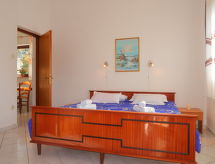"Radmila (MLK143)", apt 5 pièces 89 m2 au 1er étage. Séjour/salle à manger avec 1 divan-lit double (150 cm, longueur 200 cm), coin-cuisine, TV (satellite) et air-conditionné. 1 chambre avec 1 grand-lit (160 cm, longueur 200 cm). 1 chambre avec 2 lits (90 cm, longueur 200 cm). Sortie sur le balcon. 1 chambre avec 1 grand-lit (160 cm, longueur 200 cm). Sortie sur le balcon. 1 chambre avec 1 grand-lit (160 cm, longueur 200 cm). Salle à manger avec coin-cuisine, TV (satellite) et air-conditionné. Cuisine/séjour (2 plaques de cuisson, lave-vaisselle, grille-pain, bouilloire électrique, four micro-ondes, cafetière électrique) avec table pour les repas, TV (satellite) et air-conditionné. 3 douches/WC. Chauffage (en sus), air-conditionné (en sus). 2 balcons. Mobilier de balcon, chaises longues. A disposition: lave-linge, lit bébé. Internet (Connexion WIFI, gratuit). Veuillez noter: maison non-fumeur. Maximum 3 animaux/ chiens autorisés. Pas de liaison interne entre les différentes unités. La maison est composée de 3 appartements différents loués sous forme d’une seule unité.- Installations