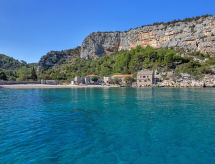 Immeuble "Rubin". À 4 km du centre de Zastražišće, situation tranquille, ensoleillée, à 10 m de la mer, à 10 m de la plage. En commun: terrain 1'000 m2. Barbecue. Infrastructures de la Maison: accès internet, location de bicyclettes. Place de parking près de la maison sur le terrain. Magasins 4 km, restaurant 15 km, plage de rochers, plage bétonnée 10 m. Veuillez noter: place d'amarrage privée, sur demande. Possibilité de location de bateaux à moteur (sur demande, en sus).Interior