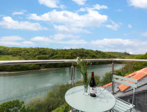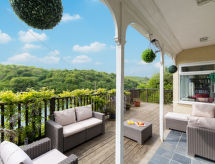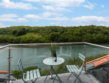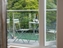 Maison 5 pièces sur 2 niveaux. Spacieux et clair, aménagement très confortable et de bon goût: séjour avec TV, écran plat, chaîne stéréo, DVD et poêle à bois. Sortie sur le jardinet. Salle à manger avec table pour les repas. Cuisine (4 plaques de cuisson, four, lave-vaisselle, four micro-ondes, congélateur). À l'étage supérieur: 2 chambres, chaque chambre avec: 1 lit double. 1 chambre avec 2 lits. WC séparé, bain/douche/WC. Chauffage. Meubles de terrasse. Très belle vue sur les alentours et la rivière. A disposition: lave-linge, sèche-linge, fer à repasser. Internet (Connexion WIFI, gratuit). Veuillez noter: logement non-fumeur. TV seulement EN.- Caractéristiques de l'hébergement