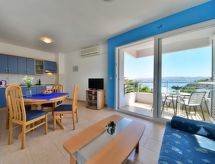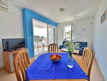 Apt 2 pièces 52 m2 au 1er étage, situation sud. Aménagement agréable et plaisant: séjour/salle à manger 24 avec 1 divan-lit double (160 cm, longueur 190 cm), TV (satellite) et air-conditionné. Sortie sur le balcon. 1 chambre avec 1 lit double (2 x 80 cm, longueur 200 cm). Cuisine ouverte (4 plaques de cuisson, four). Douche/WC. Air-conditionné (en sus). Balcon 4 m2. Meubles de terrasse. Vue sur la mer. A disposition: Internet (Connexion WIFI, gratuit). 1 animal/ chien de petite taille autorisé. Il est strictement interdit d'apporter et d'utiliser vos propres appareils électriques tels que mini-réfrigérateurs, petits congélateurs, climatiseurs mobiles et appareils similaires.- Installations