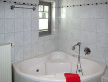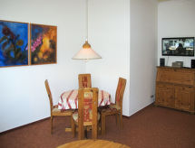 Apt 2 pièces 60 m2 au 1er étage. Aménagement fonctionnel et plaisant: séjour/chambre à coucher avec 1 divan-lit double, table pour les repas, TV (câblée) et chaîne stéréo. 1 chambre avec 1 lit double. Cuisine (4 plaques de cuisson, four, lave-vaisselle, grille-pain, bouilloire électrique, cafetière électrique). Douche/WC, balnéo. Chauffage au gaz. Moquette. A disposition: chaise haute pour enfant, lit bébé. Place de parking No 5 (1 Voiture). Veuillez noter: logement non-fumeur. Détecteur de fumée.- Installations