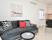 Immeuble "Silvija". Dans la localité, situation ensoleillée, à 60 m de la mer, à 60 m de la plage. En commun: terrain 2'800 m2. Barbecue, espace de jeux pour les enfants (balançoire). Infrastructures de la Maison: accès internet. Place de parking près de la maison sur le terrain. Magasins, restaurant 100 m, plage de graviers, plage bétonnée 60 m. Veuillez noter: D’autres appartements sont également proposés à la location dans cette maison de vacances.Interior