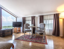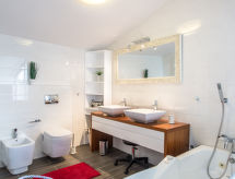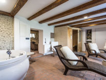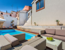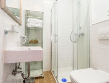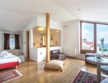 Maison mitoyenne 5 pièces 286 m2 sur 3 niveaux, situation est. Complètement rénovée en 2016, aménagement agréable et plaisant: séjour/salle à manger 44 m2 avec TV (satellite) (écran plat), air-conditionné. Sortie sur la terrasse. 1 chambre avec 2 lits (90 cm, longueur 200 cm), air-conditionné. Cuisine ouverte (four, lave-vaisselle, 4 plaques vitrocéramiques, four micro-ondes, congélateur, cafetière électrique). Douche/WC. À l'étage supérieur: 1 chambre, mansardée hauteur plafond 180 - 250 cm avec 1 lit double (2 x 90 cm, longueur 200 cm), bain/bidet/WC, double vasque, bain à remous et TV (satellite) (écran plat), air-conditionné. 1 chambre avec 2 lits (90 cm, longueur 200 cm), douche/WC et air-conditionné. 1 chambre avec 1 grand-lit (160 cm, longueur 200 cm), douche/WC et air-conditionné. Chauffage (en sus). Terrasse 18 m2. Meubles de terrasse, chaises longues. Vue éloignée sur la mer. A disposition: coffre-fort, lit bébé, sèche-cheveux. Internet (Connexion WIFI, gratuit). 1 animal/ chien autorisé. Rez-de-chaussée (escalier raide) : cave à vin mansardée (hauteur sous plafond 165 - 210 cm) avec mobilier de terrasse, réfrigérateur et climatisation (inclus dans le prix). Espace spa au rez-de-chaussée avec piscine intérieure angulaire (5 x 3 m, profondeur 100 - 120 cm, 01.01.-31.12.), bain à remous, transats, sauna finlandais, climatisation et douche/WC (tous inclus dans le prix).- Caractéristiques de l'hébergement