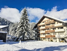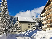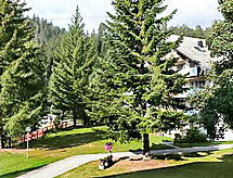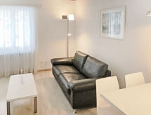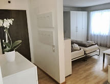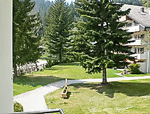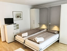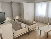 Studio 32 m2, situation nord-ouest. Aménagement confortable et plaisant: séjour/salle à manger avec 2 lits armoires et TV (satellite) (écran plat), radio et lecteur CD. Sortie sur le balcon. Coin cuisine (four, 4 plaques vitrocéramiques) avec table pour les repas. Bain/WC. Petit balcon, situation nord et situation ouest. A disposition: Internet (Connexion WIFI, gratuit). Garage No 7-5 près de la maison, hauteur 194 cm. Veuillez noter: logement non-fumeur.- Installations