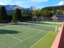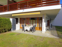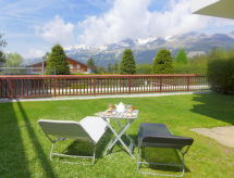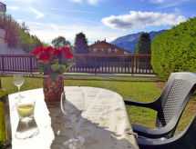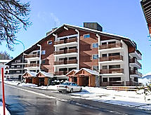 Studio 32 m2, au rez-de-chaussée, situation sud-ouest. Logement idéal pour 2 adultes + 1 enfant. Séjour avec 1 grand-lit rabattable (140 cm, longueur 190 cm), table pour les repas, TV (câblée), écran plat, radio, lecteur CD et DVD. Alcôve avec 1 lit (80 cm, longueur 180 cm). Coin cuisine (2 plaques de cuisson, grille-pain, bouilloire électrique, four micro-ondes, cafetière électrique, service à fondue (fondue au fromage)). Bain/WC. Grande terrasse, pelouse. Meubles de terrasse, barbecue électrique, chaises longues (2). A disposition: fer à repasser, sèche-cheveux. Internet (Connexion WIFI). Veuillez noter: logement non-fumeur. Petit four d'appoint. Bus navette en circulation en hiver et de fin juin à mi-septembre.- Installations