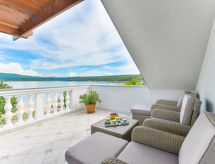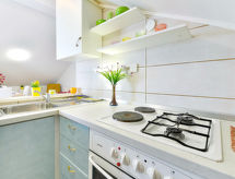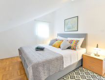 "ZAD710", apt 3 pièces 79 m2 au 2ème étage. Séjour/salle à manger mansardé avec 1 divan-lit, TV (satellite) et air-conditionné. Sortie sur la terrasse. 1 chambre mansardée avec 1 grand-lit (160 cm, longueur 200 cm), air-conditionné. 1 chambre mansardée avec 2 lits et douche/WC. Sortie sur la terrasse. Cuisine ouverte (2 plaques de cuisson, four, lave-vaisselle, 2 feux, grille-pain, bouilloire électrique, four micro-ondes, congélateur, cafetière électrique). Douche/WC. Chauffage électrique. Terrasse 40 m2. Meubles de terrasse. Vue sur la mer. A disposition: lave-linge, fer à repasser. Internet (Connexion WIFI, gratuit). Veuillez noter: entrée privée.- Installations
