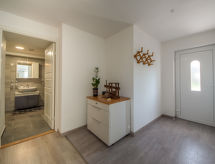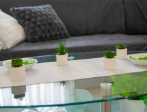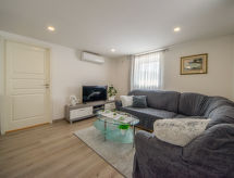 Apt 4 pièces 95 m2, au rez-de-chaussée. Séjour/salle à manger avec 1 divan-lit (100 cm, longueur 200 cm), TV (câblée) (écran plat), air-conditionné. Sortie sur la terrasse. 1 chambre avec 1 grand-lit (160 cm, longueur 200 cm). Chambre avec passage avec 1 lit double (2 x 90 cm, longueur 190 cm). 1 chambre, sans fenêtre avec 1 lit (90 cm, longueur 190 cm), douche/WC. Cuisine ouverte (4 plaques de cuisson, four, lave-vaisselle, bouilloire électrique, congélateur, cafetière électrique). Douche/WC. Terrasse 50 m2. Meubles de terrasse, barbecue (portable), chaises longues (2). Vue sur les alentours. A disposition: lave-linge, coffre-fort. Internet (Connexion WIFI, gratuit).- Installations