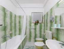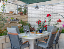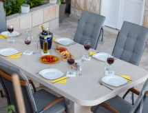 Apt 4 pièces 175 m2, au rez-de-chaussée, situation sud. Séjour/salle à manger avec 1 divan-lit (140 cm, longueur 200 cm), TV (satellite) (écran plat), air-conditionné. Sortie sur la terrasse. 1 chambre avec 1 grand-lit (160 cm, longueur 200 cm), air-conditionné. Sortie sur la terrasse. 1 chambre avec 1 lit double (2 x 80 cm, longueur 200 cm), air-conditionné. Sortie sur la terrasse. 1 chambre avec 1 lit double (2 x 90 cm, longueur 200 cm). Cuisine ouverte (4 plaques de cuisson, four, lave-vaisselle, four micro-ondes, cafetière électrique). Bain/bidet/WC, douche/WC. Terrasse 200 m2 partiellement couverte. Meubles de terrasse, chaises longues (4). Vue éloignée sur la mer. A disposition: lave-linge, lit bébé, sèche-cheveux. Internet (Connexion WIFI, gratuit).- Activités à proximité