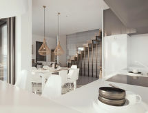 "Villa Great", villa 4 pièces 150 m2 sur 4 niveaux. Spacieux et clair, aménagement confortable et moderne: séjour ouvert avec TV (satellite) (écran plat), radio, DVD et air-conditionné. Sortie sur la terrasse, sur la piscine. Grande cuisine ouverte (four, lave-vaisselle, 4 plaques vitrocéramiques, cafetière électrique) avec table pour les repas. Air-conditionné. À l'étage inférieur: (escalier sans rampe) 1 chambre, ouverte avec 1 lit double, douche/WC et TV (satellite) (écran plat). Air-conditionné. À l'étage supérieur: (escalier sans rampe) 1 chambre avec 1 lit double. Sortie sur le balcon. Douche/WC. Air-conditionné. 2ème étage: (escalier sans rampe) 1 chambre avec 1 lit double et douche/WC. Sortie sur le balcon. Air-conditionné. 2 balcons, grande terrasse. Meubles de terrasse, mobilier de balcon, barbecue, chaises longues. Belle vue sur la mer. A disposition: lave-linge, coffre-fort, fer à repasser, sèche-cheveux. Internet (Connexion WIFI, gratuit). Station d'accueil iPod. Veuillez noter: adapté(e) aux familles. Maison non-fumeur. 1476Κ10000452101- Installations