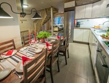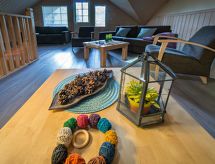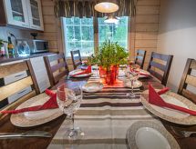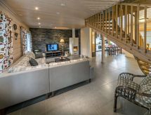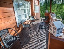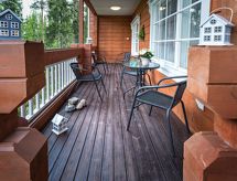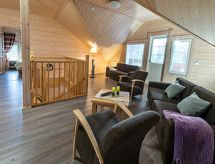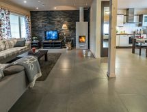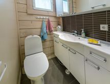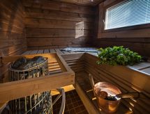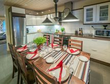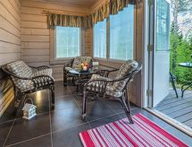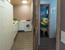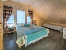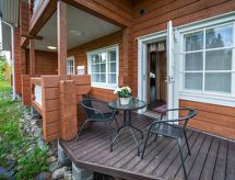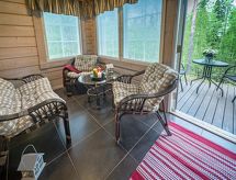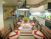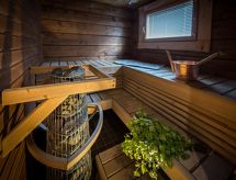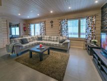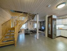 Cet appartement dans une maison en rondins mitoyenne à Vuokatti a été achevé en mars 2010. Superficie 145 m² (balcon compris). Au rez-de-chaussée il y a un salon, une cuisine, une chambre avec lits jumeaux, une salle de séjour, un sauna (chauffage électrique), une buanderie / WC et un WC séparé. Terrasse. A l'étage, il y a une chambre avec lits jumeaux et un lit séparé et un lit en alcôve (entrée par la chambre) pour 2 (pas de fenêtres et toit bas / en pente). Deux canapés-lits pour 2-4 personnes dans vestibule grenier, terrasse. Détails supplémentaires: 2 x TV, connexion Internet (câble Ethernet et WLAN, 300/10 Mt). Pompe à chaleur air pour le chauffage et le refroidissement. Lit et chaise pour bébé + barrières de sécurité dans les escaliers. Kajaani à 35 km, Sotkamo à 8 km. Piste de ski de Vuokatti 3,5 km, piste de ski de fond 50 m. Lac à 2 km. Les animaux domestiques sont admis moyennant un supplément, à partir du 1.9.2020. Arrivée à 16 h le jour d'arrivée et départ à 12 h le jour du départ, également en cas de week-end.- Installations
