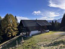 Chalet 3 pièces 120 m2 sur 2 niveaux. Aménagement simple et rustique: séjour avec table pour les repas. 1 chambre double. Cuisine) avec poêle à bois. À l'étage inférieur: douche/WC. À l'étage supérieur: 1 chambre avec 3 lits doubles. Grand jardinet. Superbe vue panoramique sur la vallée et les alentours. Veuillez noter: détecteur de fumée. Les 2 lits doubles au rez-de-chaussée sont dans 2 alcôves séparées par un mur mais sans portes. La douche et les WC à l‘étage inférieur sont accessibles uniquement par la terrasse (balcon).- Installations