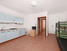 "4 Mori, Residence (MUV101)", 2 -sobni apartman 35 do 40 m2. Svrsishodno uređen: dnevno-spavaća soba s 1 kaučem za 1 osobu i 1 x 2 kreveta na kat, stolom za blagovanje i TV-om sa sat. prijemnikom. 1 soba s 1 bračnim krevetom. Kuhinjska niša (4 plamena za kuhanje). Tuš/WC. El. grijanje, klima uređaj. Balkon ili terasa (natkrita). Garnitura za sjedenje. Na raspolaganju: visoka dječja stolica, dječji krevetić.- postrojenja