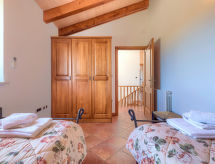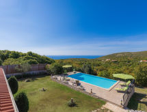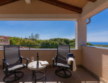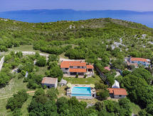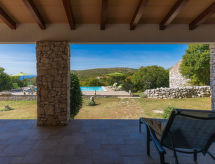 5 -sobna vila 220 m2 na 2 etaže. Lijepo i ukusno uređena: veliki dnevni boravak/blagovaona s otvorenim kaminom, TV-om sa sat. prijemnikom, DVD-om i klima uređajem. Izlaz na terasu. 1 soba s 2 kreveta (80 cm, dužina 190 cm). Otvorena kuhinja (4 ploče za kuhanje, pećnica, perilica za suđe, mikrovalna pećnica, zamrzivač). Odv. WC. Gornji kat: 2 sobe, svaka soba s 1 franc. krevetom (160 cm, dužina 190 cm), tušem/bidetom/WC-om i klima uređajem. Izlaz na terasu. 1 soba s 2 kreveta (80 cm, dužina 190 cm), klima uređajem. Kada/bidet/WC. Velika terasa 40 m2 (natkrita), 2 male terase. Garnitura za sjedenje, ležaljke. Pogled na more. Na raspolaganju: dječji krevetić. Internet (wireless LAN [WLAN], besplatan).- Aktivnosti u blizini