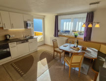 "Alpenliebe (KPL657)", 3 -sobni apartman 75 m2, na gornjem katu. Lijepo uređen: 2 sobe, svaka soba s 1 krevetom, 1 bračnim krevetom i umivaonikom. Izlaz na balkon. Kuhinja/dn. boravak (pećnica, perilica za suđe, 4 staklokeramičke ploče za kuhanje, toster, kuhalo za vodu, mikrovalna pećnica, el. aparat za kavu) s stolom za blagovanje i TV-om sa sat. prijemnikom. Izlaz na balkon. Kada/WC. Grijanje na naftu. Balkon. Balkonski namještaj, vrtni roštilj. Panoramski pogled na planine i dolinu. Na raspolaganju: visoka dječja stolica, dječji krevetić. Internet (wireless LAN [WLAN], besplatan). Dodatna informacija: apartman za nepušače. 1 kućni ljubimac / pas dozvoljen. Protupožarni alarm, vatrogasni aparat.- postrojenja