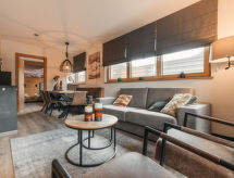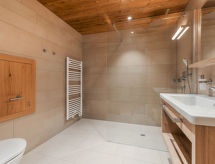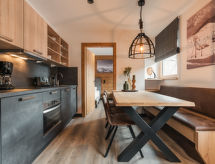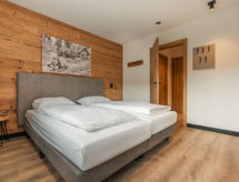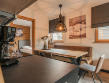 "Typ A", 3 -sobni apartman 56 m2. Svijetlo, komforno i ukusno uređen: 2 bračne sobe. Dnevno-spavaća soba s TV-om sa sat. prijemnikom i plosnatim TV ekranom. Otvorena kuhinja (perilica za suđe, 4 staklokeramičke ploče za kuhanje, toster, kuhalo za vodu, zamrzivač, el. aparat za kavu) s stolom za blagovanje. Tuš/WC, odv. WC. Terasa. Garnitura za sjedenje. Lijep pogled na skijašku stazu i krajolik. Na raspolaganju: Internet (wireless LAN [WLAN], besplatan). Dodatna informacija: apartman za nepušače. 1 kućni ljubimac / pas dozvoljen.- postrojenja