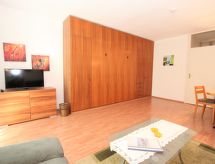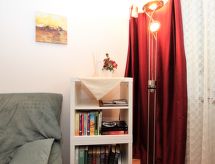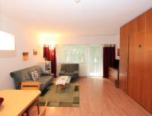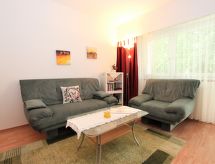 1 -sobni apartman 33 m2, u povišenom prizemlju. Udobno uređen: dnevni boravak/blagovaona s 1 rasklopnim ormar-krevetom za 2 osobe, kabelskom TV i radiom. Kuhinja (4 ploče za kuhanje, pećnica). Tuš/WC. Balkon. Balkonski namještaj. Na raspolaganju: telefon. Dodatna informacija: apartman za nepušače. Najviše 1 kućni ljubimac / pas dozvoljen. Protupožarni alarm.- postrojenja