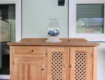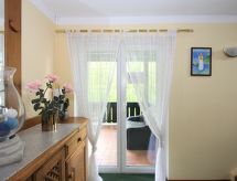 3 -sobni apartman 86 m2, u povišenom prizemlju. Renoviran godine 2018, udobno uređen: predsoblje. Velika dnevno-spavaća soba s 1 kaučem za 2 osobe i TV-om sa sat. prijemnikom (plosnatim TV ekranom). 1 bračna soba. 1 bračna soba s kadom/WC-om. Kuhinja/dn. boravak (pećnica, perilica za suđe, 4 staklokeramičke ploče za kuhanje, gril) s kutom za blagovanje i TV-om sa sat. prijemnikom (plosnatim TV ekranom), kaljevom peći. Velika terasa 20 m2 (natkrita). Garnitura za sjedenje, ostava. Lijep pogled na planine i krajolik. Na raspolaganju: perilica za rublje. Internet (wireless LAN [WLAN]). Dodatna informacija: apartman za nepušače. Prekrasna, velika terasa dostupna je za jednokrevetnu upotrebu, to je pola katu više od stana i dostupna je preko stubišta. Dostupan je dodatni WC (pokraj vrata, isti kat). Kaljeva peć se ne grije drvom, već električno. Upozorenje: Nema mogućnosti punjenja za električne automobile. Preuzimanje ključeva 7 km od apartmana.- postrojenja