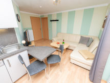 2 -sobni apartman 33 m2, na gornjem katu. Udobno uređen: dnevni boravak/blagovaona s stolom za blagovanje i TV-om sa sat. prijemnikom (plosnatim TV ekranom), DVD-om. 1 bračna soba. Kuhinjska niša (4 ploče za kuhanje, pećnica, perilica za suđe, toster, kuhalo za vodu, el. aparat za kavu). Tuš/WC. Grijanje na plin. Na raspolaganju: Internet (wireless LAN [WLAN], besplatan). Dodatna informacija: apartman za nepušače. Protupožarni alarm.- postrojenja