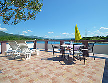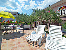 3 -sobni apartman 60 m2, u prizemlju, prema jugu. Dnevni boravak/blagovaona 20 m2 s 1 kaučem za 2 osobe (160 cm, dužina 200 cm), TV-om sa sat. prijemnikom (plosnatim TV ekranom), klima uređajem. Izlaz na terasu. 1 soba s 1 franc. krevetom (160 cm, dužina 200 cm), tušem/WC-om. 1 soba s 2 kreveta (90 cm, dužina 200 cm), tušem/WC-om. Otvorena kuhinja (pećnica, perilica za suđe, 4 staklokeramičke ploče za kuhanje, mikrovalna pećnica, zamrzivač, el. aparat za kavu). Terasa 10 m2. Garnitura za sjedenje. Pogled na more. Na raspolaganju: Internet (wireless LAN [WLAN], besplatan). 1 mali kućni ljubimac / pas dozvoljen.- postrojenja
