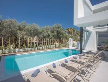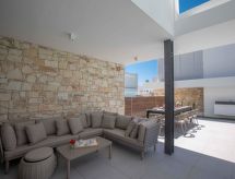This luxury and brand new 5 bedroom, 3 storey villa is located in a prime, central Ayia Napa location, just a few minutes walk to Nissi Avenue and all its beaches and amenities. The villa is newly built and fully equipped with new and contemporary furniture and fittings to ensure a comfortable stay. As you enter the villa, you will find the spacious, and very modern open-plan living room, kitchen and dining area, with large patio doors leading to the garden and pool. The living room features a comfortable corner sofa, widescreen Smart TV with satellite channels and wi-fi connection. The dining area has a table and chairs to seat 10 people and the kitchen is fully equipped with all appliances and utensils needed for an enjoyable self-catering stay. One of the five bedrooms can be found on the ground floor with a double bed, and you will also find one of the bathrooms with shower and WC. Upstairs, you will find three of the bedrooms, one double and two twin bedrooms. The master bedroom has an en suite bathroom with shower and WC. All bedrooms are complete with wardrobes and bedside cabinets. The main family bathroom with shower and WC is also on this floor. Downstairs, on the lower ground floor level which is accessed from the living room, you will find the remaining bedroom with two single beds and access to the veranda. There is another bathroom on this floor with a shower and WC, and a communal area with a full sized football table and table tennis. Outside, the beautiful and sizeable garden offers a barbecue, work-top and sink area, outside shower, a generous-sized dining area with seating for 10 people, an extra seating area with comfortable sofas, sunloungers and the large, private pool, ideal for those hot days lazing in the Cyprus sun.There is full air-con and WI-FI throughout the villa. This stunning and elaborate villa, in an ideal central location is the ultimate choice for families or groups of friends looking for a peaceful, relaxing and luxurious break. Bedroom 1: 1 Double Bed with En-Suite Bathroom / Bedroom 2: 2 Single Bed / Bedroom 3: 2 Single Beds / Bedroom 4 (Ground Floor): 1 Double Bed / Bedroom 5 (Basement): 2 Single Beds.- Značajke smještaja