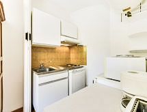 1 -sobni studio 30 m2, u prizemlju, prema zapadu. Svrsishodno i lijepo uređen: dnevno-spavaća soba s panoramskim prozorom s 1 kaučem za 1 osobu (160 cm, dužina 200 cm), TV-om (plosnatim TV ekranom). Izlaz na terasu, prema zapadu. Kuhinjska niša (2 ploče za kuhanje, toster, kuhalo za vodu, el. aparat za kavu, kombinirana mikrovalna pećnica). Tuš, odv. WC. El. grijanje, klima uređaj. Terasa 25 m2. Garnitura za sjedenje, ležaljke (2). Na raspolaganju: perilica za rublje, glačalo, sušilo za kosu. Internet (wireless LAN [WLAN], uz doplatu). Parking br. 45. Dodatna informacija: apartman prema parkingu. TV samo FR. Protupožarni alarm.- Značajke smještaja