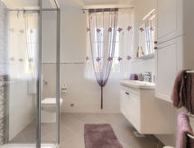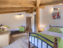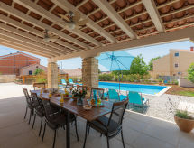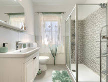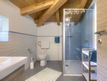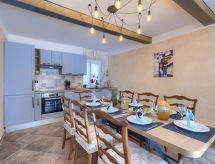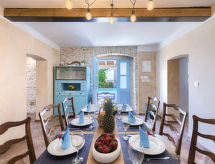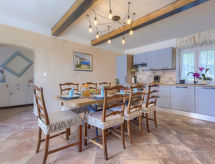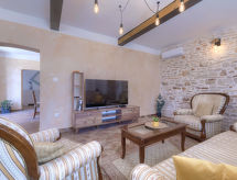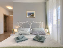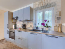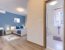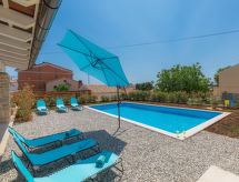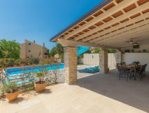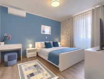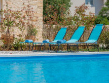 5 -sobna kuća 180 m2 na 3 etaže. Dnevni boravak/blagovaona s TV-om sa sat. prijemnikom. Izlaz na terasu. Otvorena kuhinja (pećnica, perilica za suđe, 4 staklokeramičke ploče za kuhanje, kuhalo za vodu, mikrovalna pećnica, zamrzivač, el. aparat za kavu). Tuš/WC. Gornji kat: 2 sobe, svaka soba s 1 franc. krevetom (160 cm, dužina 200 cm), tušem/WC-om i klima uređajem. 2. Gornji kat: 1 soba s 1 franc. krevetom (160 cm, dužina 200 cm), klima uređajem. 1 soba s 2 kreveta (90 cm, dužina 200 cm), klima uređajem. Tuš/WC. Terasa 50 m2 (natkrita). Garnitura za sjedenje, ležaljke. Pogled na bazen i vrt. Na raspolaganju: sef, dječji krevetić, sušilo za kosu. Internet (wireless LAN [WLAN], besplatan). 1 mali kućni ljubimac / pas dozvoljen.- postrojenja