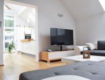 "Appartement Ligist", 4 -sobni penthouse 168 m2. Objekt pogodan za 6 + 2 djece. Svijetlo, djelomično spušten strop, vrlo komforno i moderno uređen: dnevno-spavaća soba s krovnim prozorom s 1 kaučem za 2 osobe, otvorenim kaminom i digitalnim TV. 1 bračna soba s Garderoba s TV-om sa sat. prijemnikom. 1 bračna soba s TV-om sa sat. prijemnikom. 1 bračna soba. Velika kuhinja/dn. boravak (pećnica, perilica za suđe, 4 Indukcione ploče, toster, kuhalo za vodu, zamrzivač, el. aparat za kavu, kuhalo za vodu) s stolom za blagovanje. Izlaz na terasu. Kada/tuš, 2 x odv. WC. El. grijanje, podno grijanje. Parketni pod. Garnitura za sjedenje, električni roštilj. Na raspolaganju: perilica za rublje, sušilica, visoka dječja stolica, dječji krevetić. Internet (wireless LAN [WLAN]). Dodatna informacija: kuća za nepušače. Protupožarni alarm.- Značajke smještaja