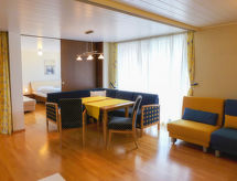 "Appartmenthaus Skyline 309", 2 -sobni apartman 53 m2 na 3. katu. Svijetlo, komforno uređen: dnevno-spavaća soba s 2 kauča za 1 osobu (90 cm, dužina 200 cm), stolom za blagovanje, TV-om sa sat. prijemnikom i radiom. Izlaz na balkon, prema jugozapadu. 1 soba s kliznim vratima s 1 bračnim krevetom (2 x 85 cm, dužina 190 cm). Otvorena kuhinja (4 ploče za kuhanje, pećnica, perilica za suđe, toster, kuhalo za vodu, el. aparat za kavu). Kada/WC. Grijanje. Parketni pod. Lijep pogled na planine i mjesto. Na raspolaganju: sušilo za kosu. Parking uz kuću. Prikladno za obitelji.- postrojenja