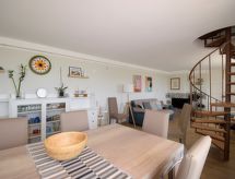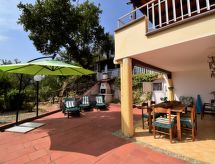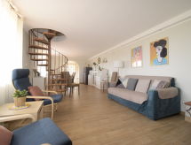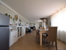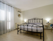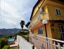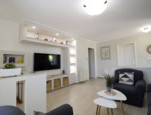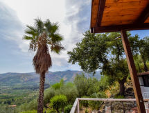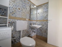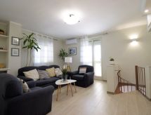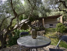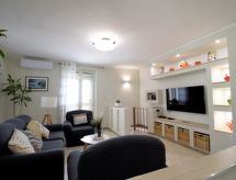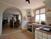 5 -sobna vila 115 m2 na 2 etaže. Komforno i ukusno uređena: dnevni boravak/blagovaona s panoramskim prozorom s 1 kaučem za 2 osobe, švedskom peći i klima uređajem. Kuhinjska niša (4 ploče za kuhanje, pećnica, perilica za suđe, mikrovalna pećnica, zamrzivač, el. aparat za kavu) s odv. WC-om. Izlaz na terasu. Gornji kat: (kružne stepenice) dnevni boravak s 1 kaučem za 2 osobe i TV-om (plosnatim TV ekranom), klima uređajem. Izlaz na balkon. 1 bračna soba s TV-om (plosnatim TV ekranom), klima uređajem. 1 soba s 2 kreveta i klima uređajem. Tuš/bidet/WC, kada/tuš/bidet/WC. Grijanje, grijanje na drva, grijanje toplim zrakom. Grijanje na raspolaganju samo od 01.12. do 31.03. Balkon 15 m2, terasa 40 m2 (djelomično natkrita) terasa 25 m2 (natkrita). Garnitura za sjedenje, vrtni roštilj, ležaljke. Djelomičan pogled na more, planine i krajolik. Na raspolaganju: perilica za rublje, glačalo, mrežice protiv komaraca, visoka dječja stolica, dječji krevetić do 2 godine, sušilo za kosu. Internet (wireless LAN [WLAN], besplatan). Parking (2 automobila). CIR:19083034C208320- postrojenja